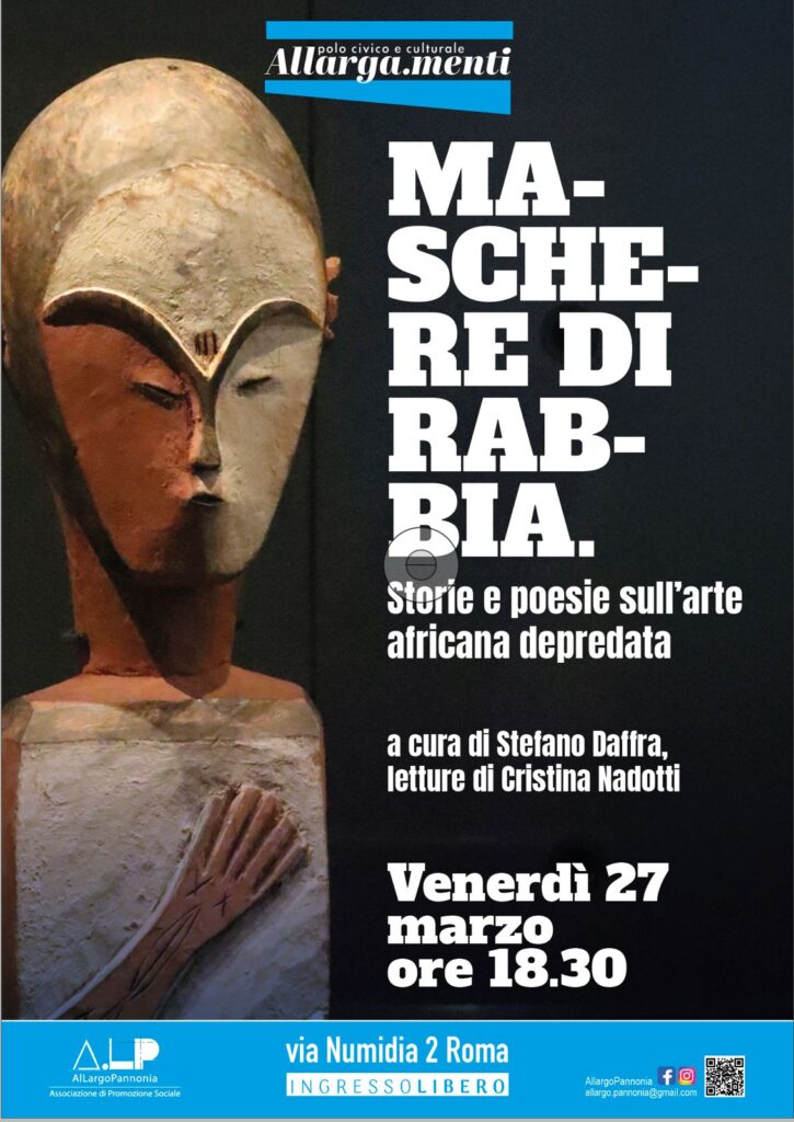 La predazione dell’arte africana depredata raccontata attraverso brani di poesie, saggi e articoli giornalistici. Autori come Ben Okri, Leopold Senghor, Wole Soyinka, Zeinab Badawi o di esperti d’arte africana come Ezio Bassani o giornalisti, un riassunto di quel che ha fatto il colonialismo europeo con l’arte a sud del Sahara (Africa occidentale e centrale), perché tante opere si trovano nei musei occidentali, come mai a molte opere non è stato riconosciuto lo status di arte, come questo atteggiamento stia in molti casi cambiando, a che punto è il dibattito sulle restituzioni ai Paesi di origine come la Nigeria.torie e poesie sull’arte africana depredata