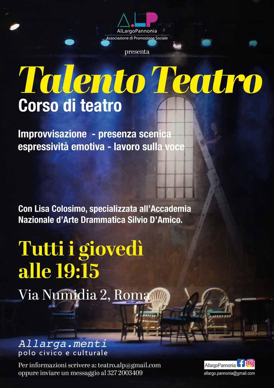 Sono cominciati l’11 gennaio e andranno avanti fino a maggio tutti i giovedì alle 19.15 i corsi di “Talento Teatro” per adulti ospitati presso Allarga.menti, via Numidia 2, Roma.
