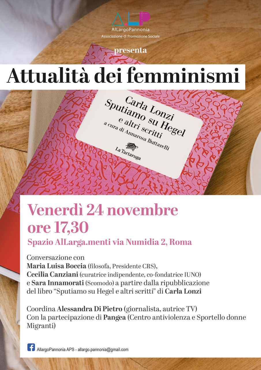 Conversazione con: Maria Luisa Boccia (filosofa, presidente Crs), Cecilia Canziani (curatrice indipendente, cofondatrice IUNO), Sara Innamorati (Scomodo) a partire dalla ripubblicazione del libro Sputiamo su Hegel e altri scritti di Carla Lonzi. Coordina: Alessandra Di Pietro (giornalista, autrice TV)Con la partecipazione di Pangea (Centro antiviolenza e Sportello donne migranti)