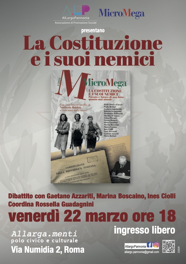 Venerdì 22 marzo, ore 18 parliamo de “La Costituzione e i suoi nemici“, il nuovo numero della rivista Micromega. Alla conversazione pubblica partecipano Gaetano Azzariti (costituzionalista), Marina Boscaino (insegnante), Ines Ciolli (costituzionalista). Coordina la giornalista Rossella Guadagnini.