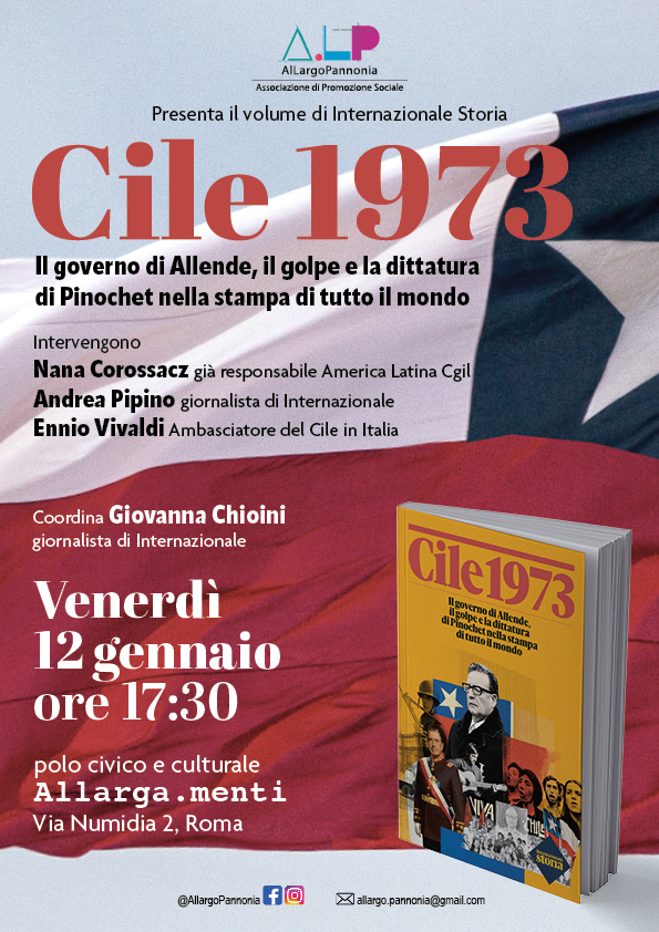 Venerdì 12 gennaio, alle 17.30, presentazione del volume dedicato dalla rivista “Internazionale” ai 50 anni dal golpe in Cile.Una conversazione con Ennio Vivaldi, Ambasciatore del Cile in Italia; Nana Corossacz, già responsabile America Latina della Cgil; Andrea Pipino e Giovanna Chioini, giornalistə di “Internazionale”.