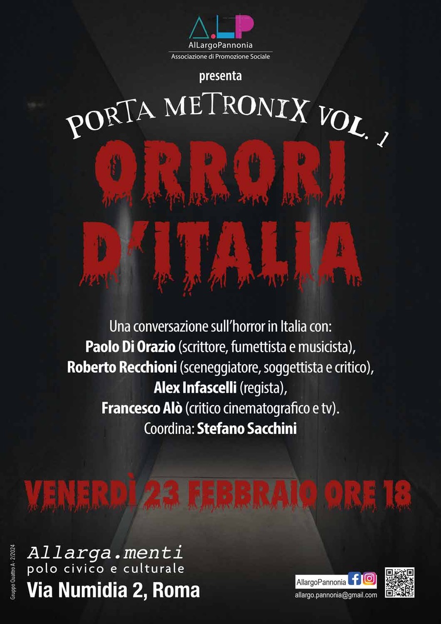enerdì 23 febbraio, alle 18, ad Allarga.menti parliamo di Orrori d’Italia. Una conversazione sulla letteratura, il cinema e il fumetto di genere, coordinata da Stefano Sacchini. Saranno nostri ospiti Paolo Di Orazio (scrittore, fumettista e musicista, in particolare con Latte e i suoi derivati). Roberto Recchioni (sceneggiatore, soggettista e critico: curatore per 10 anni di Dylan Dog), Alex Infascelli (regista, in particolare di…