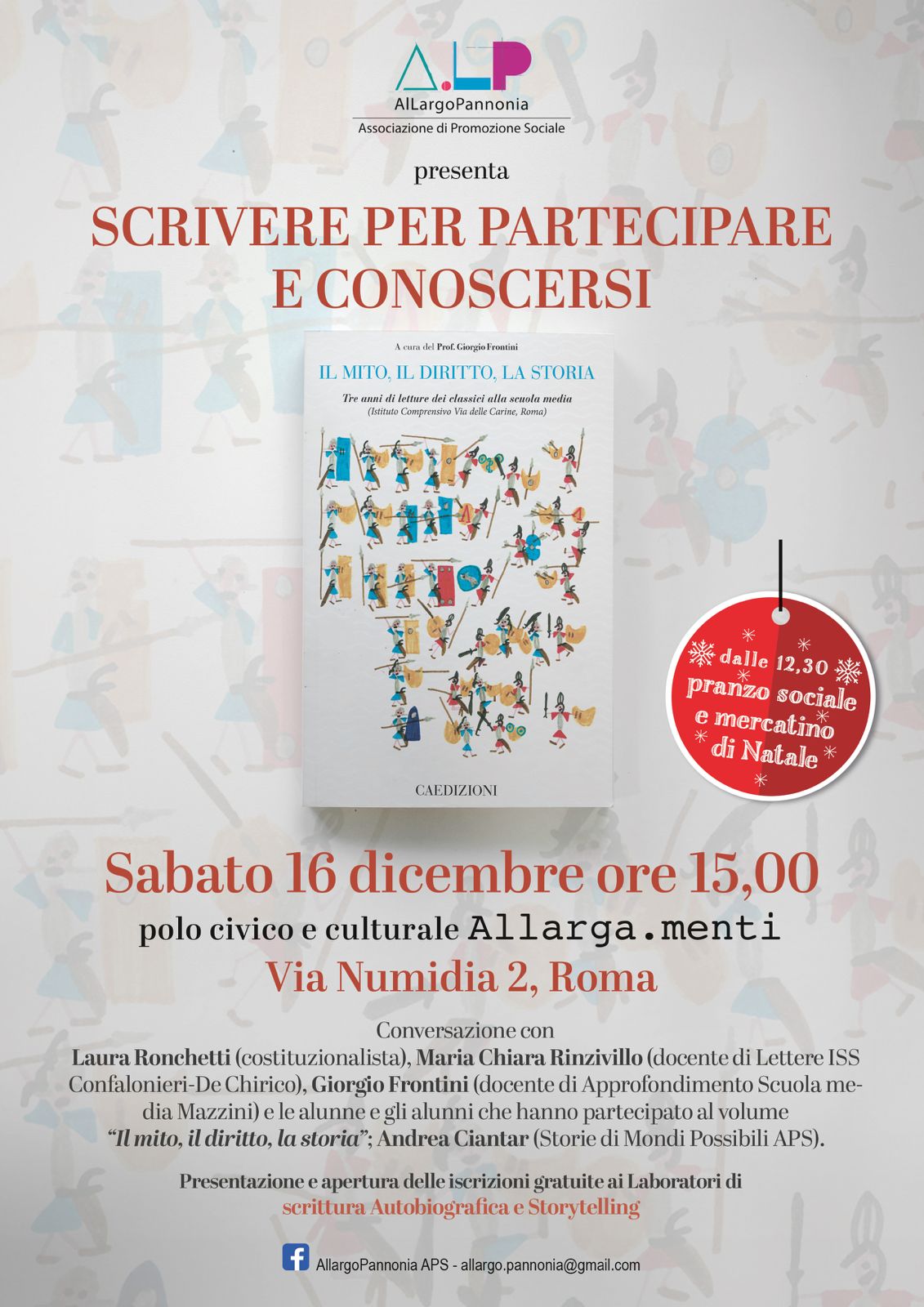 Conversazione sull’importanza della scrittura come partecipazione e conoscenza di sé e anche il lancio di un laboratorio gratuito di scrittura autobiografica, con Laura Ronchetti (costituzionalista), Maria Chiara Rinzivillo (docente Iss Confalonieri-De Chirico), Giorgio Frontini (docente scuola media Mazzini) e le alunne e gli alunni che hanno partecipato al volume Il mito, il diritto, la storia; Andrea Ciantar (Storie di Mondi Possibili APS).